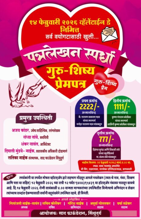 ‘एल. एम. नाईक स्मृती प्रित्यर्थ’ साद फाऊंडेशन सिंधुदुर्गच्या वतीने १४ फेब्रुवारी व्हॅलेंटाईन डे निमित्त दरवर्षी प्रमाणे याहीवर्षी पत्र लेखन स्पर्धा आयोजित करण्यात आली आहे. स्पर्धेचे हे चौथे वर्ष आहे. गेल्यावर्षी हि स्पर्धा सातासमुद्रापार पोचलेली आहे. गुरु-शिष्य प्रेमपत्र असा स्पर्धेचा विषय असून गुरु–शिष्य प्रेमपत्र म्हणजे शिष्याने आपल्या गुरुंबद्दल मनात असलेला आदर, श्रद्धा, कृतज्ञता आणि समर्पण व्यक्त करण्यासाठी लिहिलेले पत्र होय. येथे “प्रेम” या शब्दाचा अर्थ रोमँटिक प्रेम नसून गुरुंच्या ज्ञानावर, मार्गदर्शनावर आणि व्यक्तिमत्त्वावर असलेली निष्ठा व आपुलकी असा आहे. या पत्राचा मुख्य उद्देश म्हणजे गुरुंनी दिलेल्या शिक्षणामुळे शिष्याच्या जीवनात झालेले सकारात्मक बदल सांगणे, त्यांच्या शिकवणीचे महत्त्व स्पष्ट करणे आणि गुरु–शिष्य नात्याची पवित्रता अधोरेखित करणे. तसेच शिष्याने आपले विचार, भावना आणि कृतज्ञता नम्रपणे व्यक्त करणे हाही यामागचा हेतू आहे. थोडक्यात, गुरु–शिष्य प्रेमपत्र हे ज्ञान, संस्कार आणि आदर यांचे भावनिक प्रतिबिंब आहे.