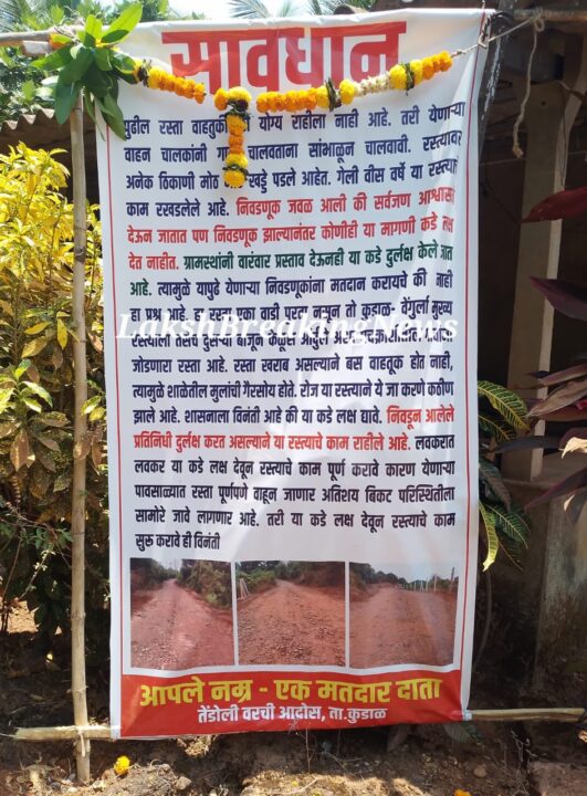या बॅनर मध्ये असे केले आहे की, पुढील रस्ता वाहतुसाठी योग्य राहिलेला नाही. तरी येणा-या वाहन चालकांनी गाडी चालवताना सांभाळून चालवावी. रस्त्यावर अनेक ठिकाणी मोठ मोठे खड्डे पडले आहेत. गेली वीस वर्षे या रस्त्या काम रखडलेले आहे. निवडणूक जवळ आली की सर्वजण आश्वासन देऊन जातात पण निवडणूक झाल्यानंतर कोणीही या मागणी कडे लक्ष देत नाहीत. ग्रामस्थांनी वारंवार प्रस्ताव देऊनही या कडे दुर्लक्ष केले जात आहे. त्यामुळे यापुढे येणाऱ्या निवडणूकांना मतदान करायचे की नाही हा प्रश्न आहे. हा रस्ता एका वाडी पुरता नसून तो कुडाळ- वेंगुर्ला मुख्य रस्त्याला तसेच दुसऱ्या बाजूने केळूस, आंदुर्ले अशा पंचक्रोशीतील गावांना जोडणारा रस्ता आहे. रस्ता खराब असल्याने बस वाहतूक होत नाही, त्यामुळे शाळेतील मुलांची गैरसोय होते. रोज या रस्त्याने ये जा करणे कठीण झाले आहे. शासनाला विनंती आहे की याकडे लक्ष द्यावे. निवडून आलेले लोकप्रतिनिधी दुर्लक्ष करत असल्याने या रस्त्याचे काम राहीले आहे. लवकरात लवकर या कडे लक्ष देवून रस्त्याचे काम पूर्ण करावे, कारण येणाऱ्या पावसाळ्यात रस्ता पूर्णपणे वाहून जाण्याची दाट शक्यता असून अतिशय बिकट परिस्थितीला सामोरे जावे लागणार आहे. तरी या कडे लक्ष देवून रस्त्याचे काम सुरू करावे ही विनंती, असा आशय बॅनवर नमूद करण्यात आला असून त्याखाली आपले नम्र – एक मतदार दाता तेंडोली वरची आदोस, ता. कुडाळ असा उल्लेख करण्यात आला आहे. मात्र हा बॅनर पंचक्रोशीत चर्चेचा विषय ठरला आहे.