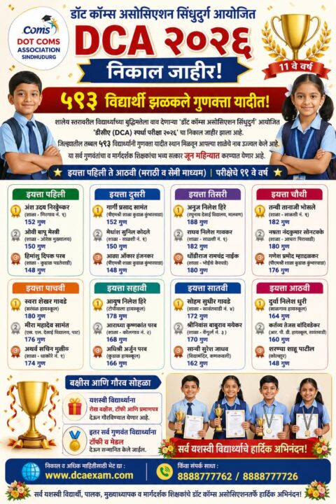 शालेय स्तरावरील विद्यार्थ्यांच्या बुद्धिमत्तेला वाव देणाऱ्या ‘डॉट कॉम्स असोसिएशन सिंधुदुर्ग’ आयोजित ‘डीसीए (DCA) स्पर्धा परीक्षा २०२६’ चा निकाल नुकताच प्रसिद्ध झाला. या परीक्षेत जिल्ह्यातील तब्बल ५९३ विद्यार्थ्यांनी गुणवत्ता यादीत स्थान मिळवून आपल्या शाळेचे नाव उज्ज्वल केले आहे. या सर्व गुणवंतांचा आणि त्यांना घडवणाऱ्या मार्गदर्शक शिक्षकांचा सत्कार जून महिन्यात करण्यात येणार आहे. इयत्ता पहिली ते आठवीच्या विद्यार्थ्यांसाठी मराठी व सेमी माध्यमातून ही परीक्षा घेण्यात आली होती. यंदा परीक्षेचे ११ वे वर्ष असून जिल्ह्यातील विविध शाळांमधून मोठा प्रतिसाद मिळाला.