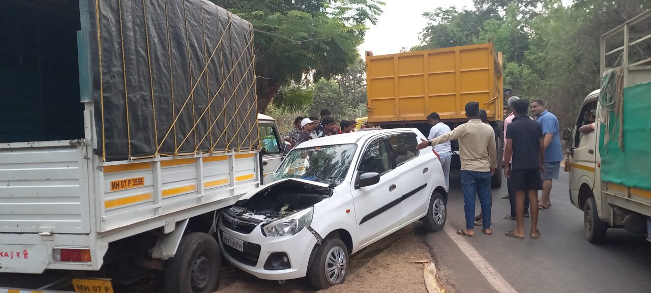 पिंगुळी – पाट रस्त्यावर पिंगुळी म्हापसेकर तिठा जवळच्या भूपकरवाडी येथे रस्त्यालगत उभ्या असलेल्या बोलेरो पीक अप जीपला समोरून येणा-या अल्टो कारची धडक बसून अपघात झाला. हा अपघात आज सोमवारी सायं. 6 वाजताच्या सुमारास झाला. उपलब्ध माहितीनुसार, पिंगुळी भूपकरवाडी येथे रस्त्यालगत बोलेरी पिक अप जीप उभी करून ठेवण्यात आली होती. समोरून पिंगुळी म्हापसेकरतिठ्याच्या दिशेने येणारी अल्टो कार रस्त्याच्या पलिकडे जाऊन तीची बोलेरोला जोराची धडक बसली. अल्टो कार मधील दोघांना किरकोळ दुखापत झाल्याचे समजते. अपघातात दोन्ही गाड्यांचे मोठे नुकसान झाले.